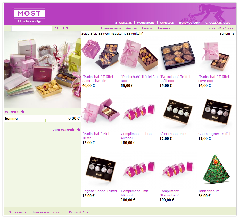 Die Shop-Plattform dient MOST als Onlineverkaufs- sowie Darstellungs-Plattform für ihre Schokolade und Pralinen. Dabei setzte der Shop auf einem xtCommerce auf und wurde durch ein angepasstes Design abgerundet.